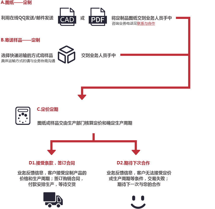 如果我們現(xiàn)有的產(chǎn)品仍然未能滿足您生產(chǎn)安裝使用的要求,在一定數(shù)量的基礎(chǔ)上,可以撥打我們的熱線服務(wù)電話或以郵件的方式將定制產(chǎn)品的圖紙發(fā)送給業(yè)務(wù)員,當(dāng)然您也可以通過(guò)添加業(yè)務(wù)QQ在線咨詢相關(guān)定制化細(xì)則,告訴我們您的定制標(biāo)準(zhǔn)、規(guī)格,隨后業(yè)務(wù)員將根據(jù)您的需求以在線、電話、郵件等方式回復(fù)定制數(shù)量、報(bào)價(jià)以及生產(chǎn)周期等信息。